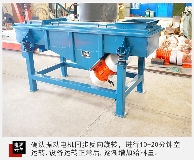 3、閉合電源開關(guān),確認振動電機同步反向旋轉(zhuǎn),進行10-20分鐘空運轉(zhuǎn),設(shè)備在運行時如有異常聲音,應(yīng)迅速關(guān)機進行檢查處理。設(shè)備運轉(zhuǎn)正常后,可將少量需篩分的物料通過進料口設(shè)入篩機內(nèi),確認物料向出料口方向行進,然后逐漸增加到所需和所能承受的給料量。