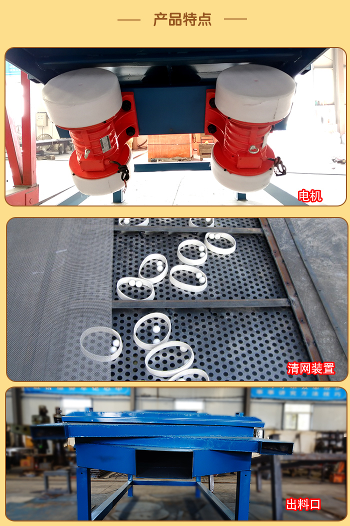 5、電機臺座:安裝振動電機,使用前連接螺釘必須擰緊,特別是新篩機試用前三天、必須反復緊固,以免松動造成事故。